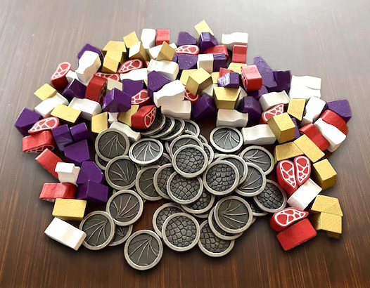 These 45 metal coins and 104 wooden resource tokens were designed specifically for Wyrmspan (the game includes cardboard tokens). All metal coins are identical, and there are 26 each of the resource tokens: meat, gem, gold, and milk.